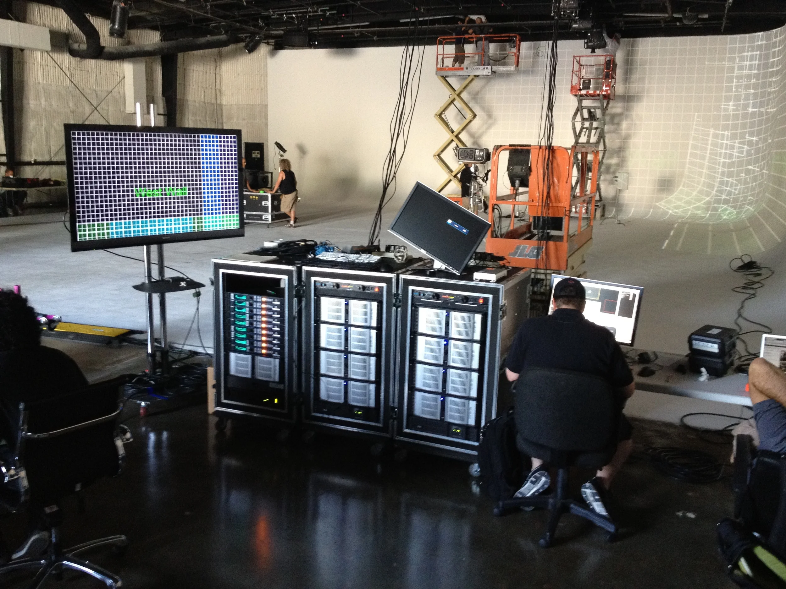 The visuals in the intro videos were all created in-camera and shot live, except for the very first shot of the 3 cars. We used 8 projectors hooked to a array of processors capable of handling the synchronized multichannel HD feed. The animations were beamed on the surface of the car and on the walls of the studio.